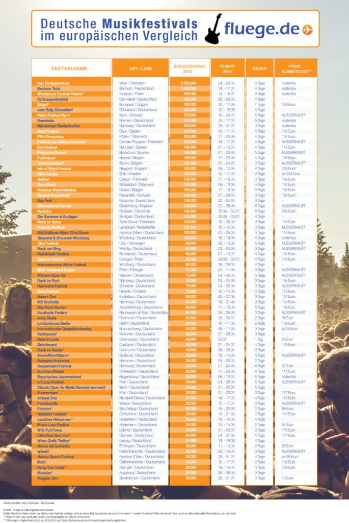 Letztes Jahr kamen die Top 50 Musikfestivals auf insgesamt 4.223.500 Besucher und auch in diesem Jahr wird auf den Festivals in Deutschland einiges los sein. Etwa 90.000 Besucher werden vom 3. bis 5. Juni zu Rock am Ring erwartet. Auf dem zeitgleich stattfindenden Rock im Park in Nürnberg dürften es etwa 75.000 sein. Mit dem BigCityBeats World Club Dome in Frankfurt findet eine weitere musikalische Großveranstaltung statt, zu der sogar bis zu 100.000 Musikfans pilgern dürften.
