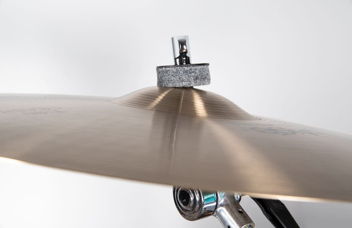 Die Becken werden am oberen Ende des Beckenständers oder -halters mit dem mittleren Loch über das Gewinde der Halterung gezogen. Dann werden sie keinesfalls sofort mit der Flügelschraube fixiert. Würdest du die Flügelschraube einfach festziehen, hättest du die Becken mit wenigen Handgriffen mundtot gemacht.